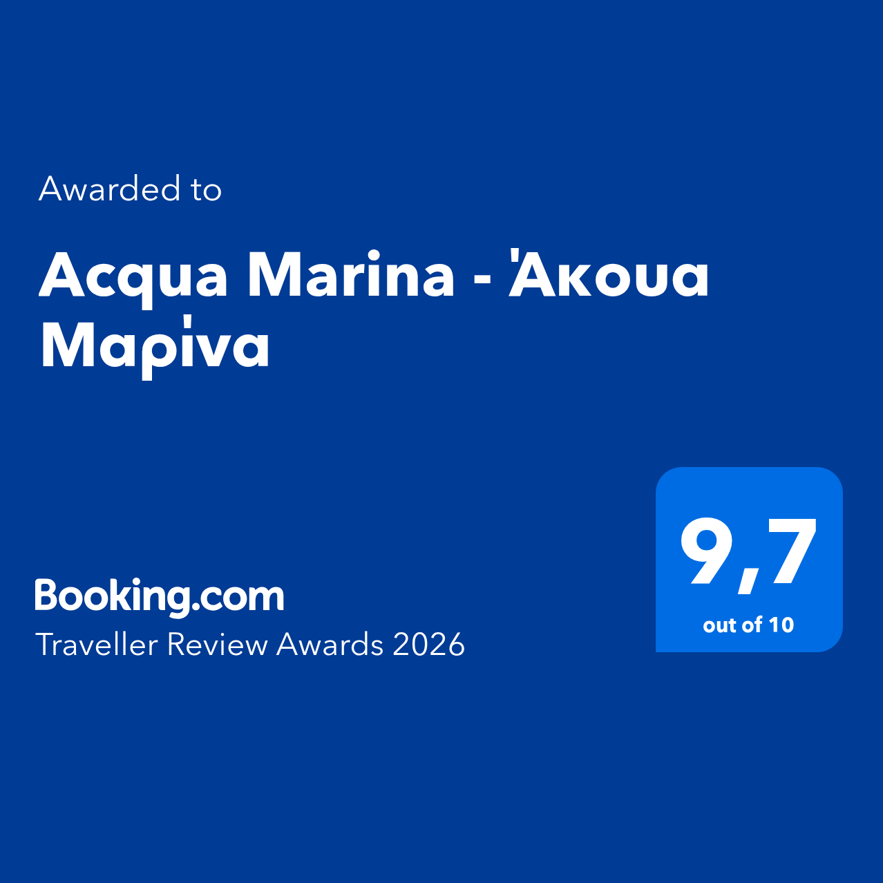 Today, we the new owners, Nicholas and Jenny Galari & our daughter Stephania-Kalomira, with respect to our parent’s expectations, collect pictures and experiences from our trips & carry all innovations and elegance to our rooms under the new name “ACQUA MARINA” with two renovations made in 2003 and 2011 promising to provide all guests personalized care, comfortable & modern facilities, amenities & full cleaning service which will make you feel «at home»….